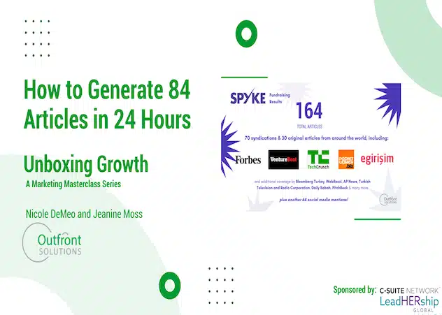 In this webinar, every month on the third Friday at 9:00 am PT / 11:00 am CT / 12:00 pm ET, global on-demand CMOs and founders of Outfront Solutions, Nicole DeMeo and Jeanine Moss, explain branding and marketing strategies, tactics, tools, tips and techniques to drive real results and revenue!  In this month’s session, Nicole and Jeanine, discussed “How to Generate 84 Articles in 24 hours” and how to generate truly impactful public relations initiatives based on creating compelling and engaging stories.  Nicole and Jeanine shared the secrets of creating truly transformational press campaigns that generate unprecedented visibility!
