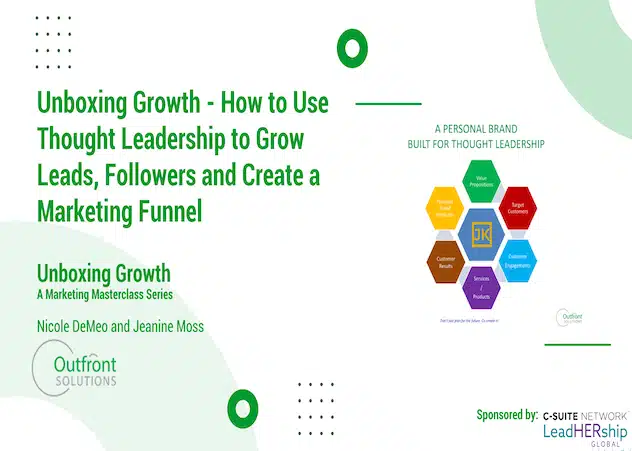 Join outsourced CMOs and Outfront founders Nicole DeMeo and Jeanine Moss for this webinar hosted by LeadHERship Global and The C-Suite Network. The Internet wasn’t created to deliver people – it’s designed to serve up content. That’s why content marketing should be the cornerstone of your growth strategy – and thought leadership content is the queen of them all.