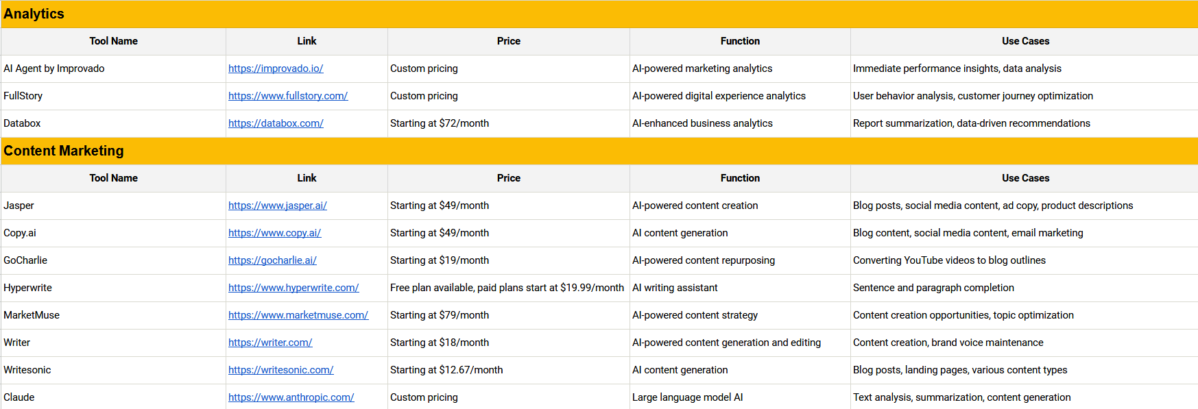Enjoy this curated spreadsheet of AI tools categorized by use case to help you incorporate AI tools into your business processes. (Continuously updated)